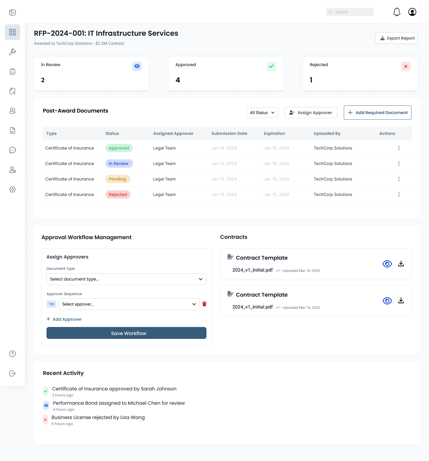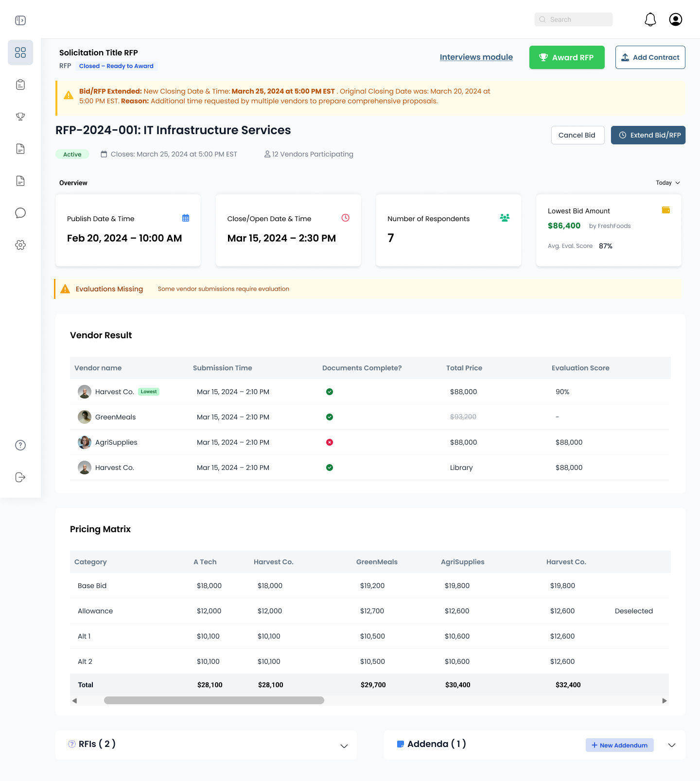 Attorneys can perform legal review, architects and construction managers can verify scope and technical accuracy, and administrators can finalize and approve the document with an auditable history of every change. Once approved, the awarded vendor can securely sign the contract in-portal, completing the workflow from solicitation to signature—all within a compliant, FOIL-ready, cloud-based system.